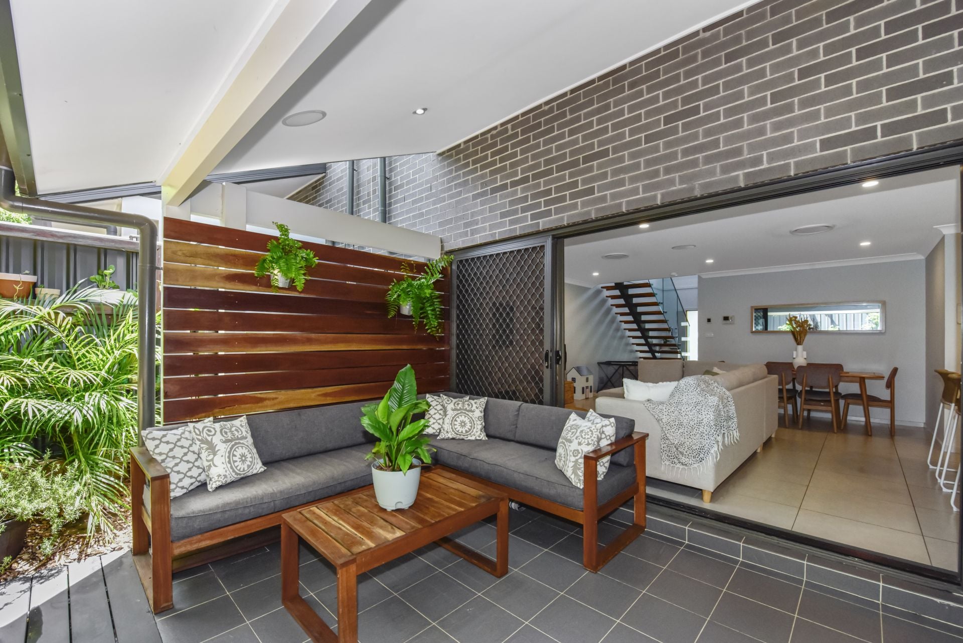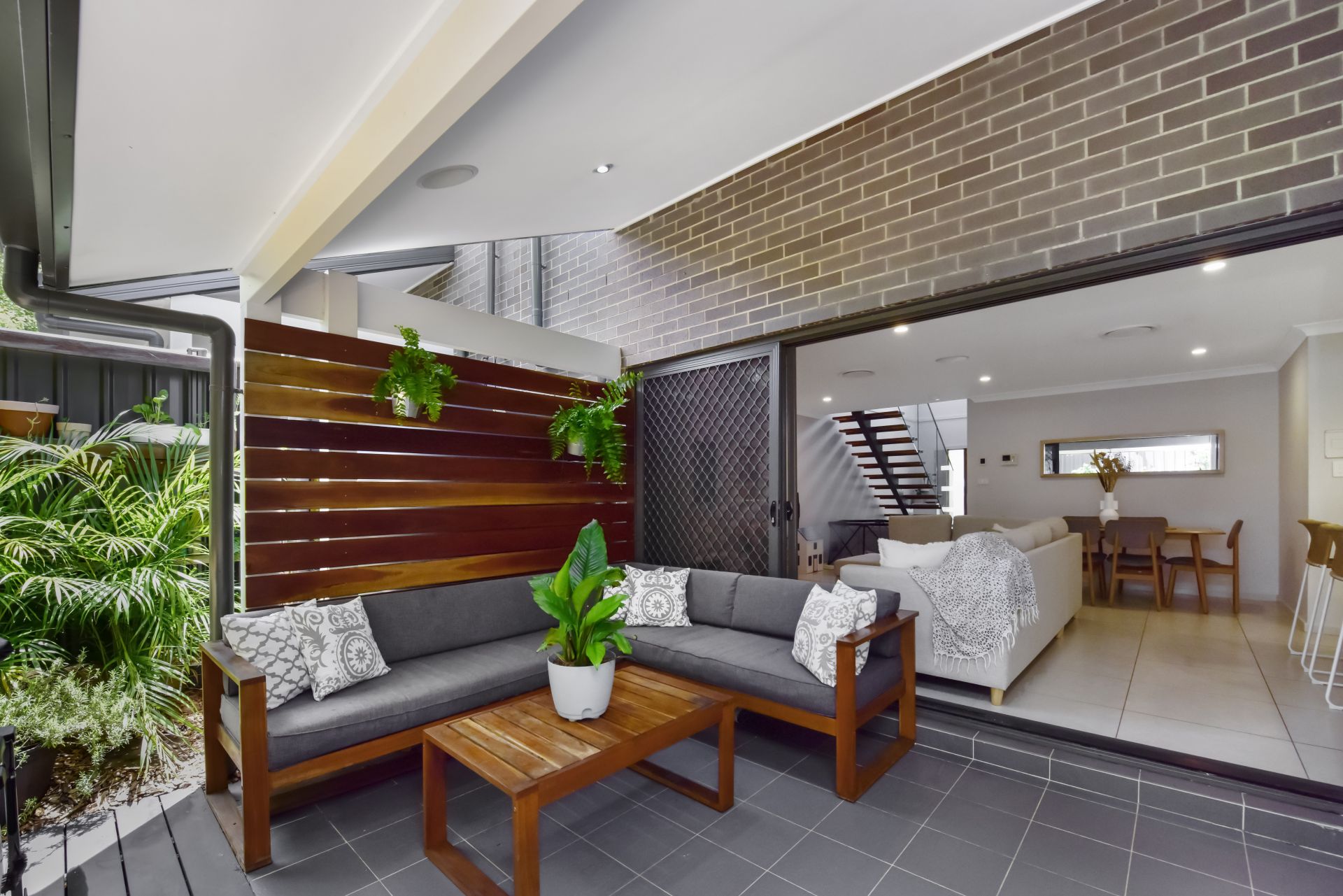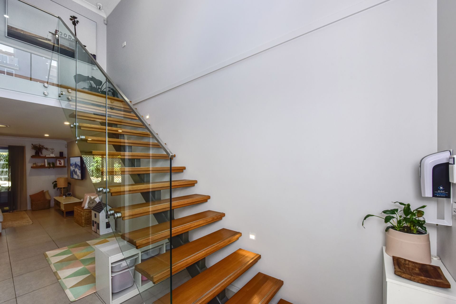 - Feature open timber tread stairs with glass balustrade